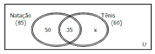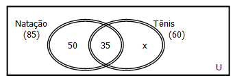 Observe que o número total de inscritos em natação é 85, como o número dos que fazem só natação é 50, faltam 35 para se encaixarem na região da interseção (inscritos nos dois esportes). Já existem no diagrama 35 inscritos em tênis, faltando, então, 25 para ocuparem o lugar do x (inscreveram-se somente para tênis). U é o conjunto universo, no qual estão contidos os outros conjuntos.